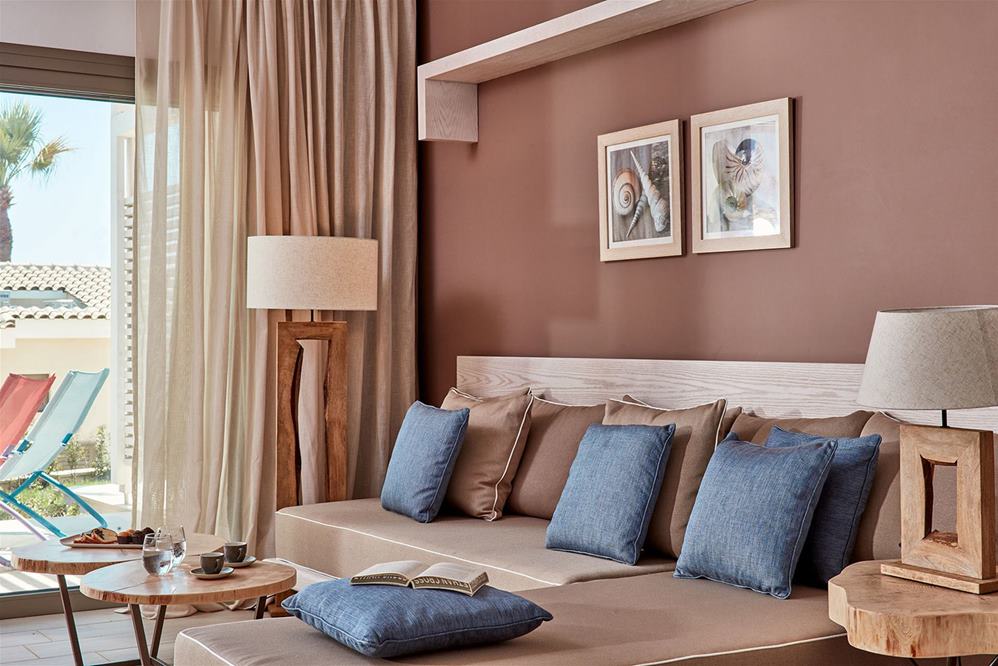 Suiten mit 1 oder 2 Schlafzimmern: 42 - 55m2 ein oder zwei separate Schlafzimmer, Wohnschlafraum mit Sofabetten für zwei Personen, sonst gleiche Einrichtung, mit Gartenblick, Meerblick oder als Swim Up Variante erhältlich.