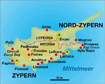 Direkt am aufgeschütteten, feinsandigen Strand; etwa 4km von Ayia Napa entfernt. Öffentliche Busverbindungen. Der Transfer vom Flughafen Larnaca zum Hotel dauert ca. 75 Min./53km